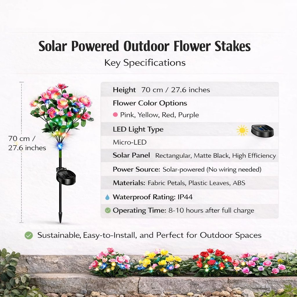 Designed with lifelike blooming flowers and gentle multi color light, each stake adds warmth and beauty as evening falls. During the day, the built in solar panel quietly collects sunlight. At night, the flowers softly illuminate the space without wires, electricity, or effort.